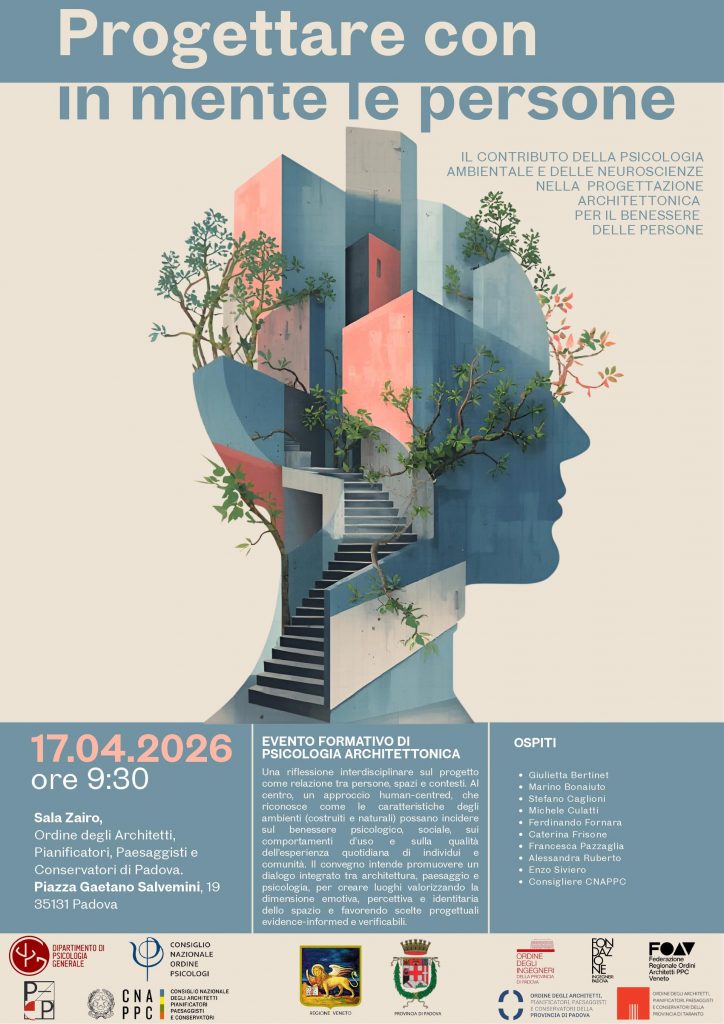 Un evento formativo promosso dall’Ordine degli Architetti, P.P.C. di Padova, con il contributo attivo dei corsisti e corsiste del Master in Psicologia Architettonica e del Paesaggio dell’Università degli Studi di Padova, e con il patrocinio del CNAPPC -Consiglio Nazionale Architetti Pianificatori, Paesaggisti e Conservatori e del CNOP – Consiglio Nazionale dell’Ordine degli Psicologi, dell’Ordine degli Architetti P.P.C di Taranto, dell’Ordine degli Ingegneri della Provincia di Padova, del Dipartimento di Psicologia Generale dell’Università di Padova, della Regione Veneto, della Provincia e del Comune di Padova, e della Fondazione degli Ingegneri di Padova.