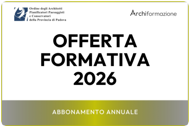 L’Ordine degli Architetti P.P.C. di Padova informa gli iscritti che è attiva la nuova Offerta Formativa 2026, realizzata in collaborazione con la piattaforma Archiformazione. La registrazione dei CFP  è automatica sulla piattaforma Nazionale.